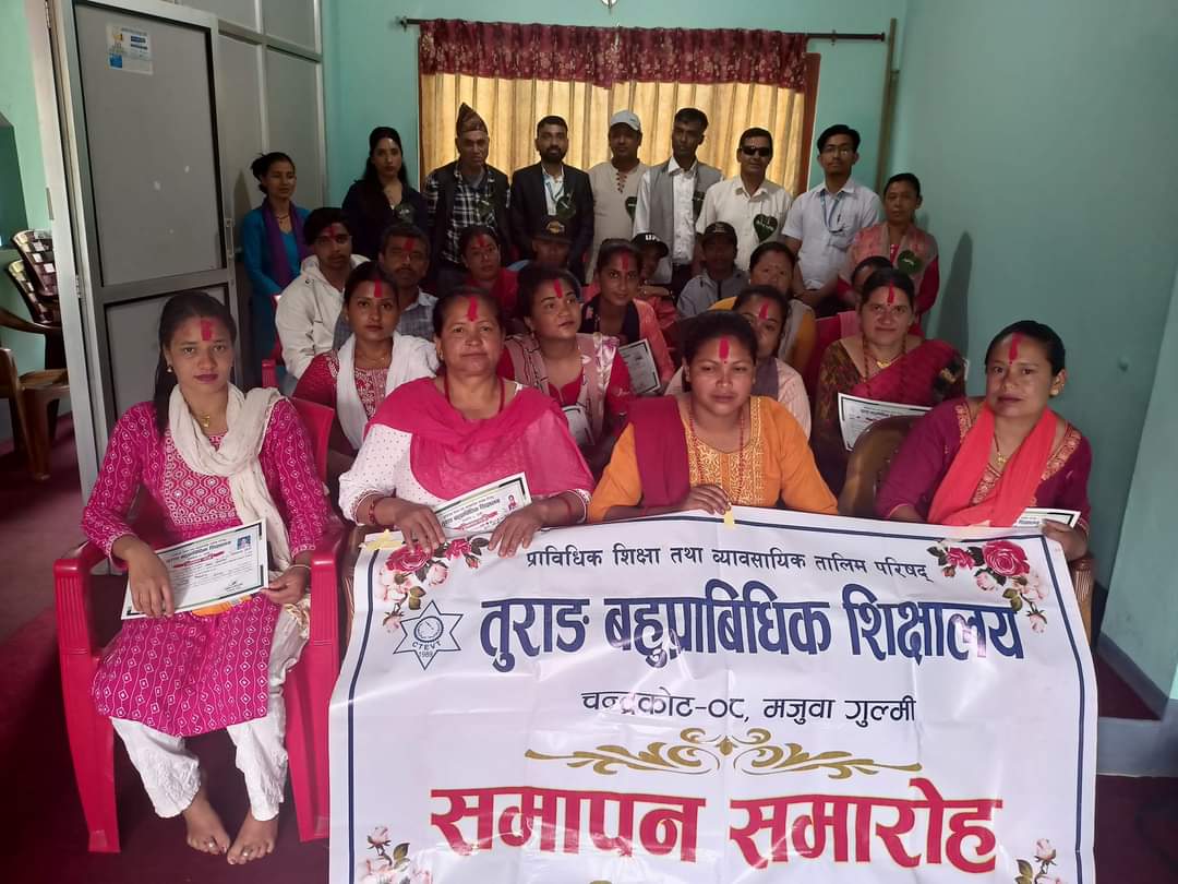 तुराङ बहुप्राबिधिक शिक्षालय चन्द्रकोट गुल्मीले रेसुङ्गा नगरपालिका वार्ड न १ र ९ सङ्गको समन्वयमा उपल्लो तमघासमा संचालन गरेको ६५ दिने निशुल्क बेमौसमी तरकारी खेती सम्बन्धि तालीमको औपचारिक समापन गरिएको छ ।सो समापन कार्यक्रममा प्रशिक्षक तथा प्रशिक्षार्थीहरुले तालिममा सिकेका बिषयहरुको बारेमा चर्चा गर्नु भएको थियो । तालीममा २० जना प्रशिक्षार्थीहरुको सहभागीता रहेको थियो भने प्रमुख अतिथि तथा बिशिस्ट अतिथि हरुले तालीमका सहभागीहरुलाइ प्रमाणपत्र समेत बितरण गर्नु भएको थियो । तालीम समापन समारोहमा प्रमुख अतिथि कोष तथा लेखा नियन्त्रण कार्यालय तम्घास गुल्मीका कोष नियन्त्रक श्री छबिन्द्र बेल्बासे रहनुभएको थियो भने रेसुङ्गा नगरपालिका वडा न १ का अध्यक्ष श्री राम प्रसाद पन्थी तथा वडा न ९ का अध्यक्ष श्री कृष्ण प्रसाद पाण्डे बिशिस्ट अतिथि रहनुभएको थियो ।