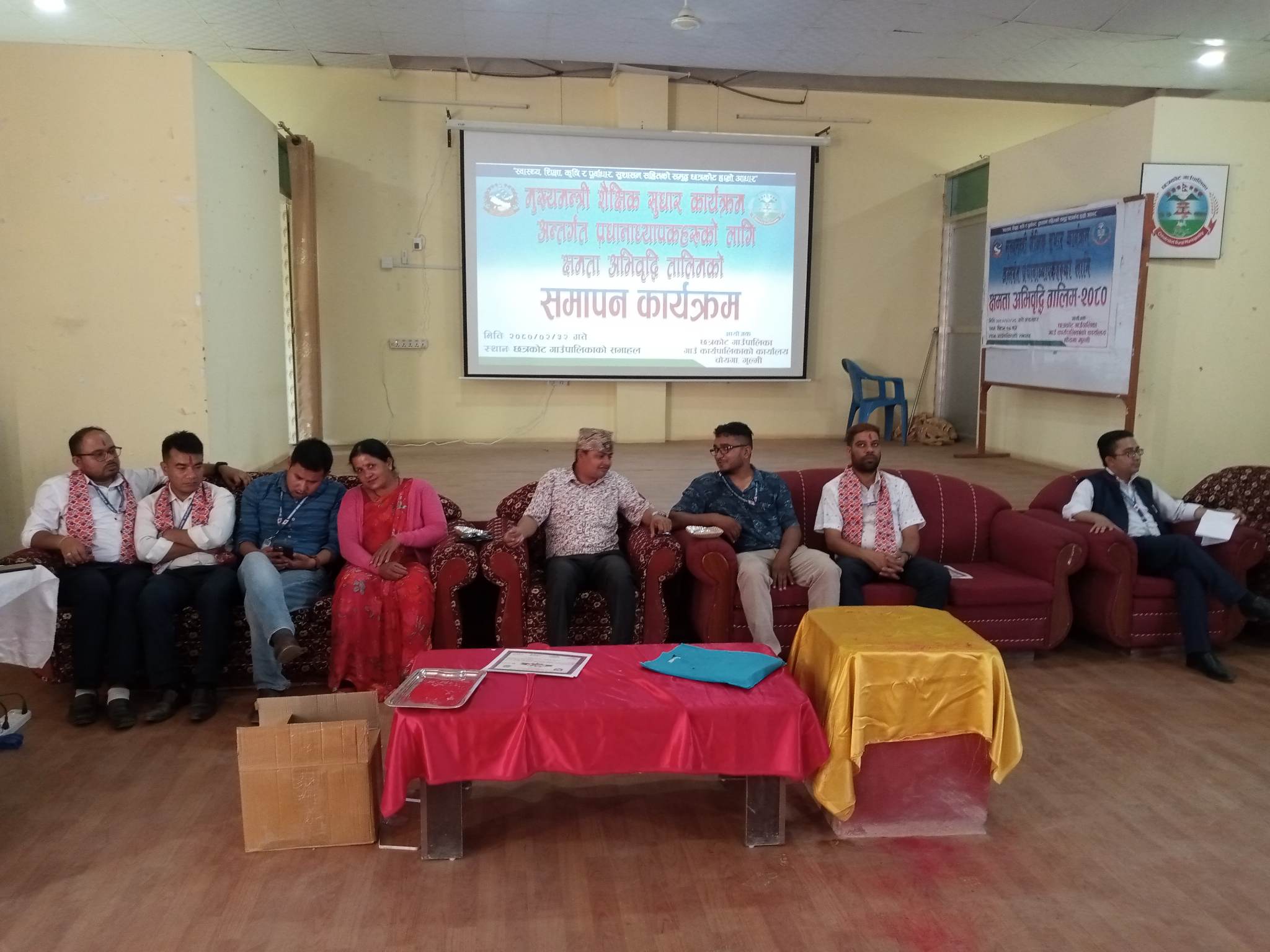 मुख्यमन्त्री शैक्षिक सुधार कार्यक्रम अन्तरगत प्रधानाध्यापकहरुको क्षमता अभिबृद्दि तालिम गुल्मीको छत्रकोट गाउँपालिकामा सम्पन्न भएको छ। छत्रकोट गाउँपालिकाको आयोजनामा संचालित तालिममा पालिका भित्रका विभिन्न विद्यालयका ३७ जना प्रधानाध्यापक हरुको सहभागीता रहेको थियो। पाँच दिन सम्म संचालित तालीमको सहजीकरण छत्रकोट गाउँपालिकाका आइ टि अफिसर भूषण भुसाल , इ एम आई एस अपरेटर गणेश सिन्जाली, रुरु क्षेत्र गाउँपालिकाका आई टि अफिसर दामोदर ज्ञवाली र शिक्षा शाखाका प्रा स बिनोद न्यौपाने ले गर्नुभएको थियोे । आधुनिक प्रबिधिको युगमा विद्यालयका प्रधानाध्यापकहरुलाई प्रबिधि सङ्ग जोडदै सबै विद्यालयहरुलाई प्रबिधि मैत्री बनाउने उद्देश्यका साथ तालिम सन्चालन गरिएको शिक्षा शाखा प्रमुख टिकाराम आचार्यले बताउनुभएको थियोे । सो अबसरमा गाउँपालिका भित्रका १७ विद्यालयहरुलाई खानेपानीको लागि २५० लिटर क्षमताका स्टिलका युरोगार्ड ड्रम वितरण गरिएको थियोे । साथै विभिन्न १० विद्यालयहरुलाई १।१ थान ल्यापटप समेत बितरण गरिएको थियोे । ल्यापटप बितरण गर्दै गाउँपालिका अध्यक्ष राम प्रसाद पाण्डेले छत्रकोट गाउँपालिकाका सबै विद्यालयहरुलाई प्रबिधि मैत्री बनाउन कम्पुटर र ल्यापटप नभएका अन्य विद्यालयलाई निकट भबिस्यमै ल्यापटप बितरण गरिने साथै युरोगार्ड ड्रम पनि सबै विद्यालयमा पुर्याउने प्रतिबद्धता व्यक्त गर्नुभएको थियोे । तालिम निकै फलदायी भएको सहभागीहरुको भनाई रहेको छ। छत्रकोट गाउँपालिका अध्यक्ष राम प्रसाद पाण्डेको अध्यक्षतामा सम्पन्न समापन समारोहमा उपाध्यक्ष साबित्रा ज्ञवाली, प्रमुख प्रसाशकिय अधिकृत वीर बहादुर पुन र प्रशिक्षकहरु को आतिथ्यता रहेको थियो । सो अबसरमा प्रशिक्षकहरुलाई सम्मान पत्र र सहभागीहरुलाई प्रमाणपत्र बितरण गरिएको थियोे । कार्यक्रममा सहभागी जित बहादुर रजालीले प्रतिबेदन प्रस्तुत गर्नुभएको थियोे भने थम्मन घिमिरे ले मन्तव्य राख्नुभएको थियोे । तालिममा सिकेका सीपलाई व्यबहारमा लागू गर्दै प्रधानाध्यापकहरु लागिपरेमा मात्र बिद्यालयलाई प्रबिधि मैत्री बनाउन सकिने र तालिमको सार्थकता हुनेकुरामा जोड दिदै अध्यक्ष राम प्रसाद पाण्डे ले तालिम को समापन गर्नुभएको थियो । कार्यक्रमको सन्चालन शिक्षा शाखा प्रमुख टिकाराम आचार्यले गर्नुभएको थियो ।