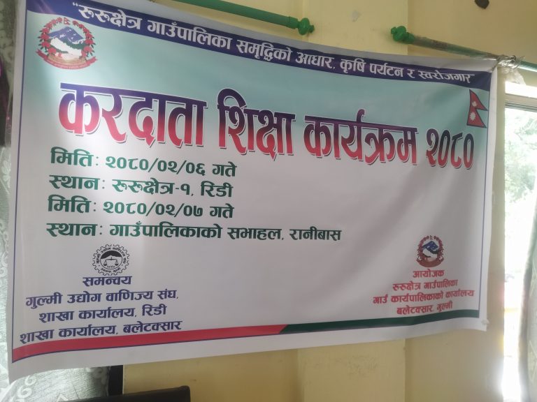 चुरामणि तिमिल्सिना जेष्ठ ७ रुरु क्षेत्र गाउँपालिकाको सभाहलमा १ दिने कर शिक्षा कार्यक्रम रसम्पन्न भएको छ । रुरुक्षेत्र गाउँपालिका गुल्मीको आयोजना , गुल्मी उद्योग बाणिज्य संघ ,शाखा कार्यालय रिडी र शाखा बलेटक्सारको समन्वयमा कार्यक्रमको आयोजना गरिएको थियो । कार्यक्रममा रुरुक्षेत्र…