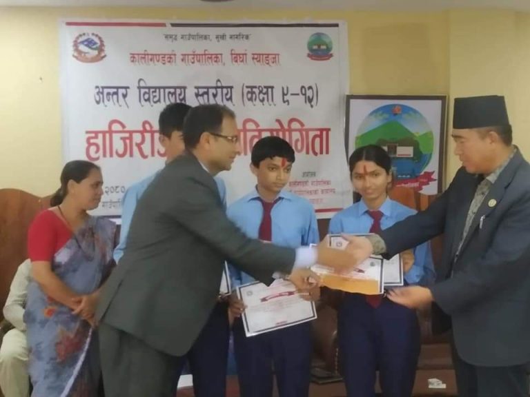 कालीगण्डकी गाउँपालिकाद्वारा अन्तर मावी स्तरीय हाजिरी जवाफ प्रतियोगिता सम्पन्न यम सोमै जेठ -८ स्याङ्जाको कालीगण्डकी गाउँपालिकाले अन्तर मा.वि. ( ९-१२) स्तरीय हाजिरी जवाफ प्रतियोगिता सम्पन्न गरेको छ। प्रतियोगीतामा कालीगण्डकी गाउँपालिका भित्रका ११ वटा माध्यमिक विद्यालयहरुले सहभागिता जनाएका थिए । सहभागीहरु…